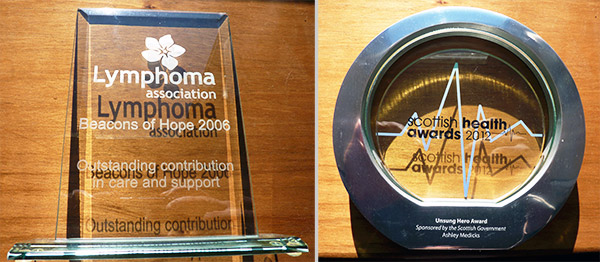 In 2006 I was fortunate enough to win the ‘Beacons of Hope’ award, offered by the Lymphoma Association, in the category, ‘Outstanding Contribution in Care and Support’, and in 2012 was offered the ‘Unsung Hero’ award in the Scottish Health Awards.